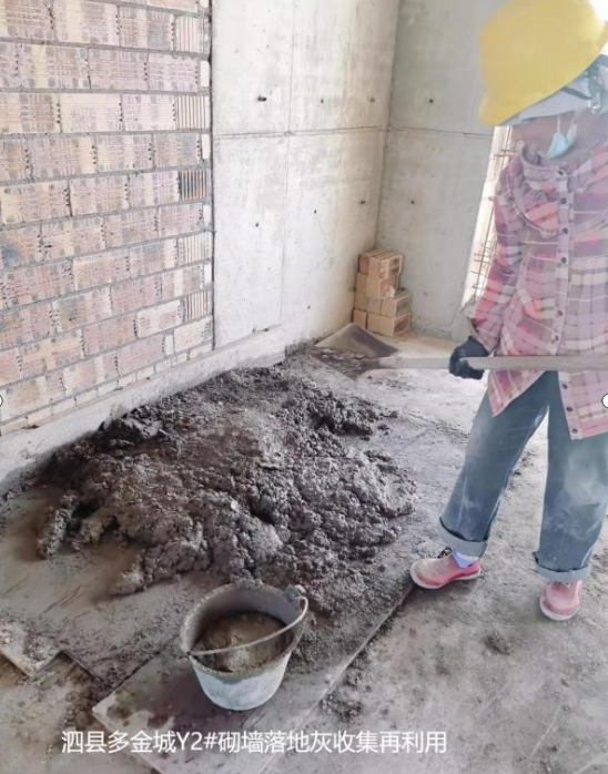 此次檢查要求砌筑階段的項目每日發(fā)布對落地灰、磚損耗的檢查水印照片于工作群,定期上報檢查情況說明。各項目積極響應,其中泗縣多金城項目在該項檢查中實施效果較為突出,在落地灰集中過篩后,摻少量水泥,利用細料作粉刷刮糙和砌墻的灰漿。落地灰的收集利用,既節(jié)約材料、降低工程成本,又有利于施工現(xiàn)場標準化的管理。